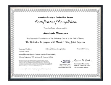 Her experience includes working for large corporate as well as small tax firms. Anastasia offers expertise in tax planning, personal and business tax return preparation, bookkeeping, audits, tax debts resolution, representation before the IRS and state tax authorities. She enjoys staying updated on the latest tax laws and never stops learning. Anastasia is currently pursuing a Juris Doctor (J.D.) degree with the aspiration of becoming a tax attorney.